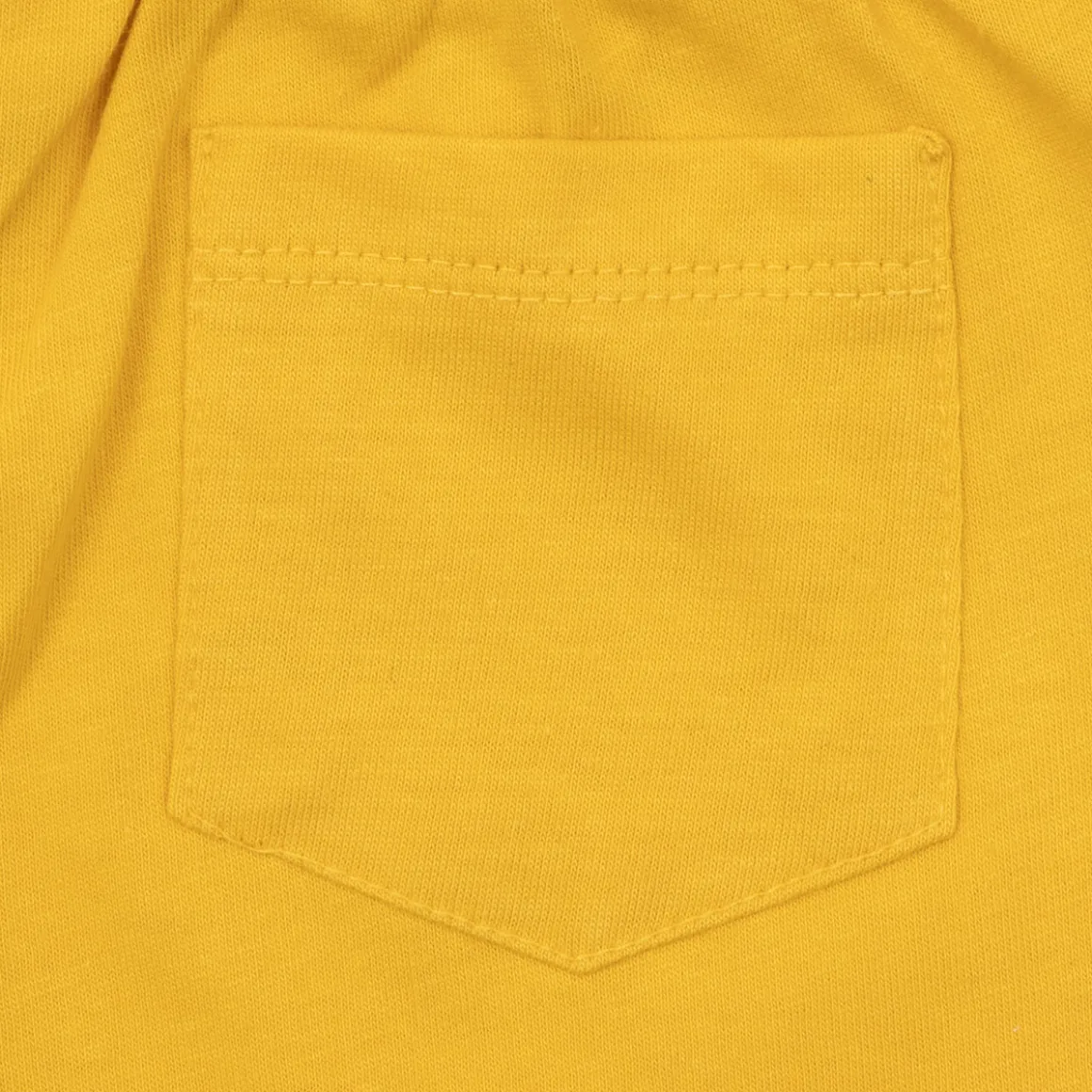Completino maglietta più pantaloncini da bambino. Pack composto da magliettina con base bianca bordata gialla e stampa simpatica piccola a tema “Dino”; più pantaloncino giallo coordinato con patch applicata lateralmente. La vestibilità è morbida e pratica grazie a bottoni a clip sulla schiena e a elastico in vita regolabile. Accessori non in vendita. La confezione contiene solo il capo d’abbigliamento