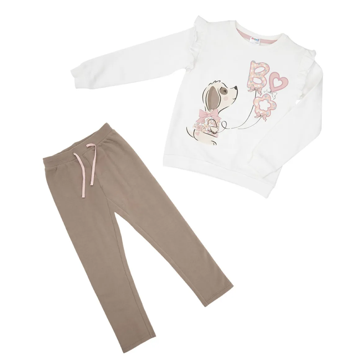 Completo jogging felpato da bambina. Il completo è composto da felpa bianco panna con frill sulle spalline e stampa grande sul davanti con particolari roba; abbinata a pantalone marrone con elastico coordinato. La vestibilità è morbida e regolabile grazie a elastico in girovita. Presente tasca posteriore sul pantalone. Accessori non in vendita. La confezione contiene solo il capo d’abbigliamento