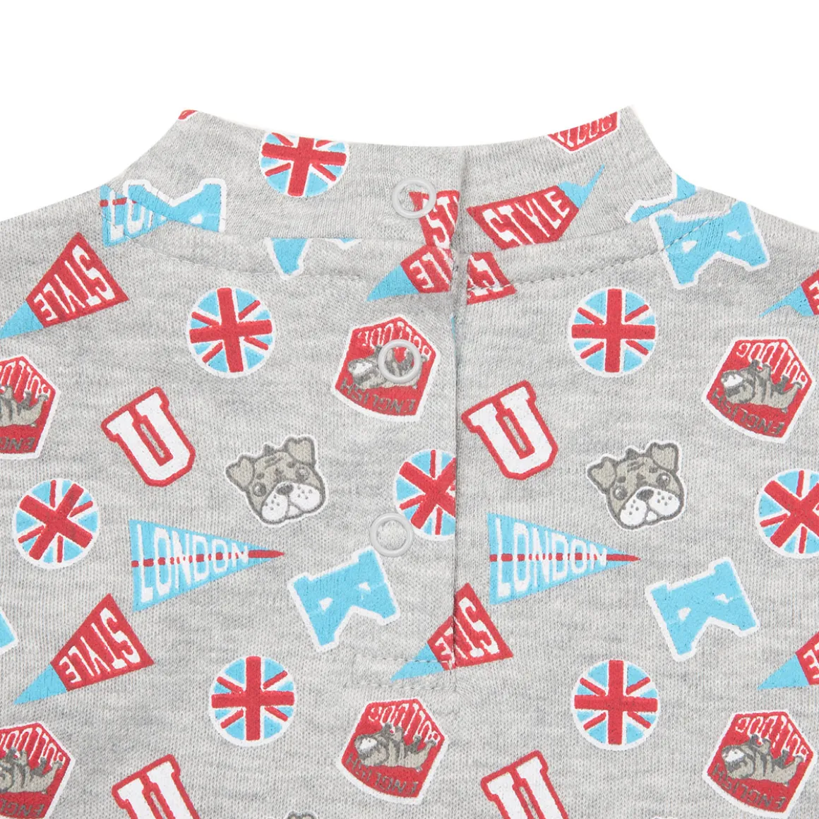 Maglia modello lupetto a maniche lunghe da bambino. Il capo si presenta in colorazione grigio chiaro con stampa allover “university”. La vestibiilità è morbida e pratica grazie ai bottoni a clip sulla schiena. Accessori non in vendita. La confezione contiene solo il capo d’abbigliamento