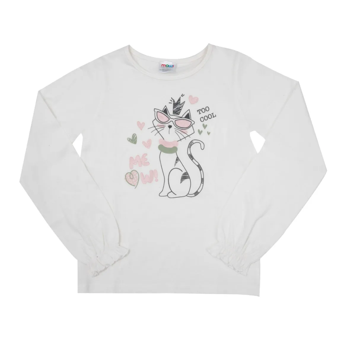 Maglia jersey a maniche lunghe da bambina. Il capo si presenta in tinta unita bianco con stampa “simpatico gatto” sul davanti. La vestibiilità è morbida. Modello girocollo con polsini arricciati. Accessori non in vendita. La confezione contiene solo il capo d’abbigliamento