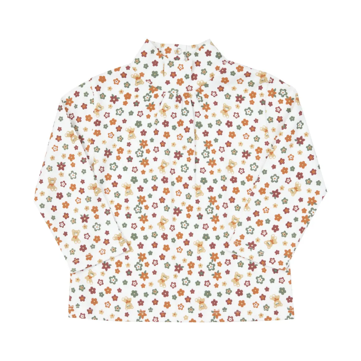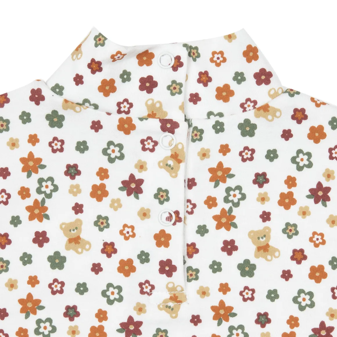 Lupetto in morbido caldo cotone in colore panna con stampa all over fiorellini. L’apertura sul retro con bottoni a pressione facilita il passaggio testa. Disponibile in diverse varianti.