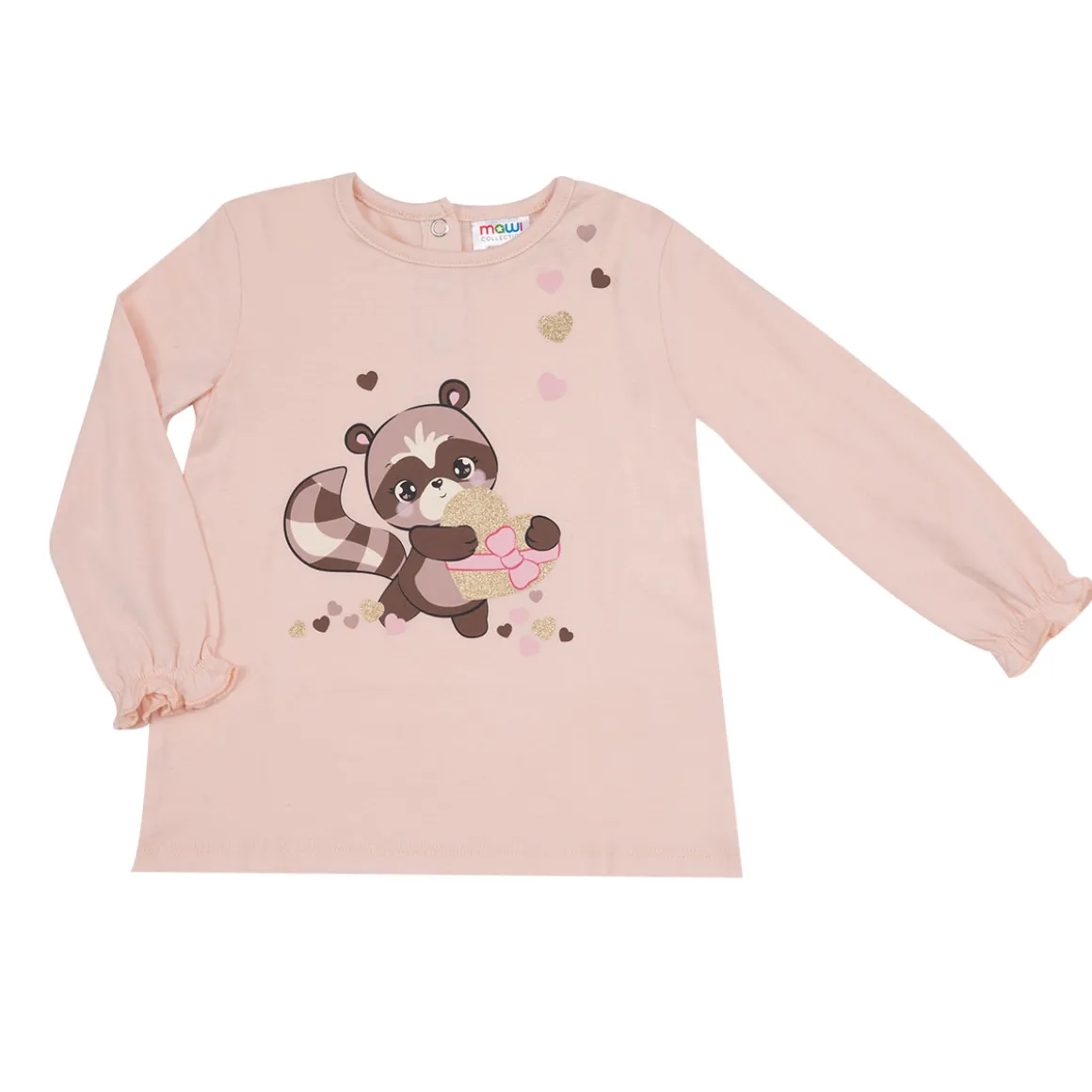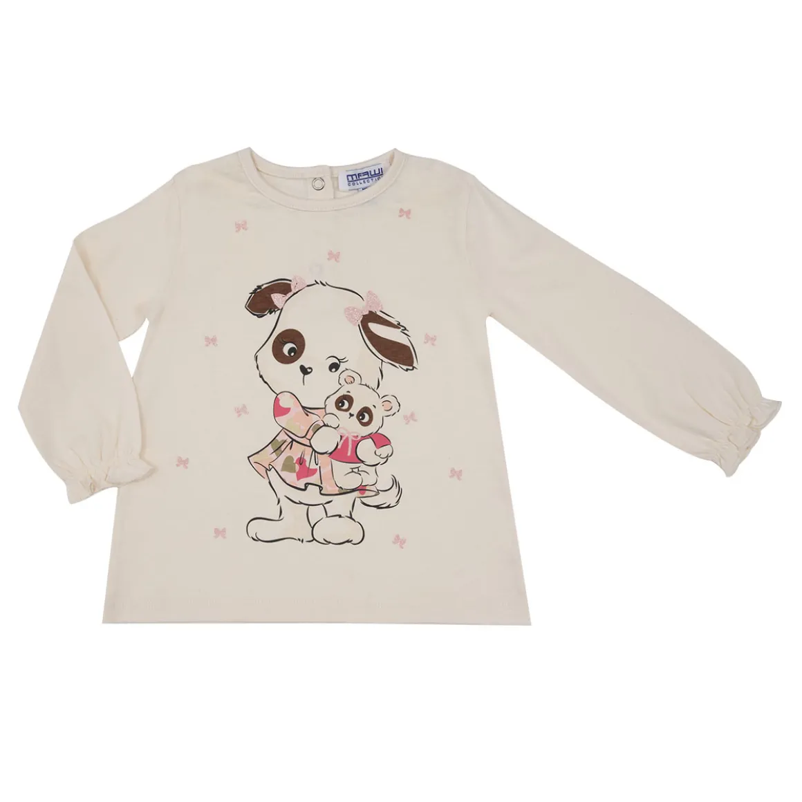 T-shirt manica lunga con polsini elasticizzati con rouches, in morbido cotone con stampa. L’apertura sul retro con bottoni a pressione facilita il passaggio testa. Disponibile in diverse varianti.