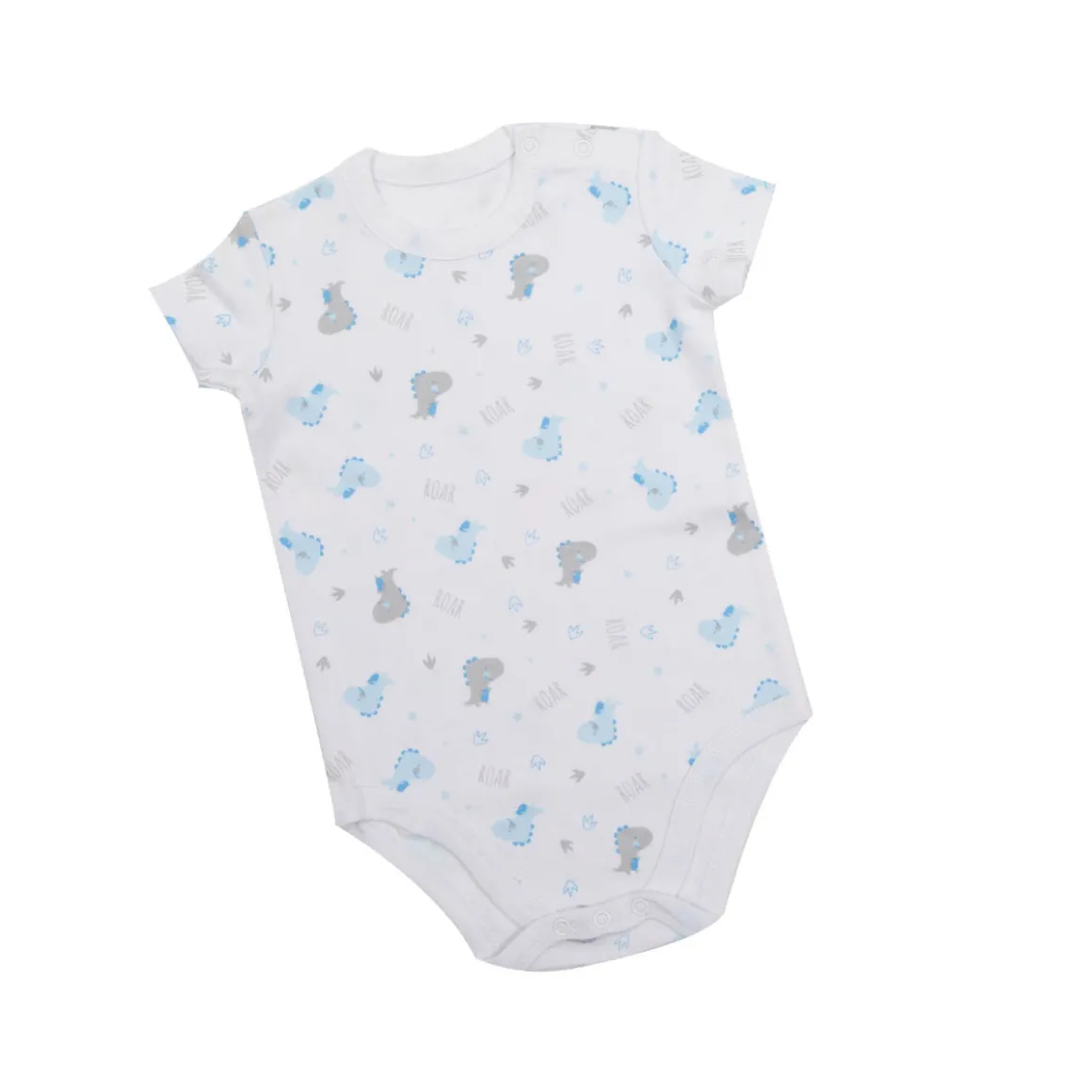 Set di 3 body manica corta in caldo cotone sui toni del bianco e azzurro con tenero dinosauro. L’apertura su spalla e l’apertura con bottoni a pressione sul cavallo facilitano il cambio del pannolino e la vestizione. Modello certifiato oeko-tex .