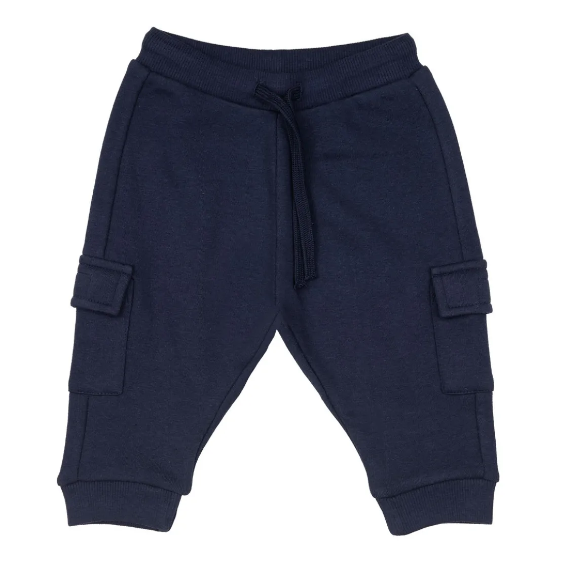 Pantalone cargo in morbida felpa garzata con vita e polsi costina in tinta. Disponibile in diverse varianti colore.