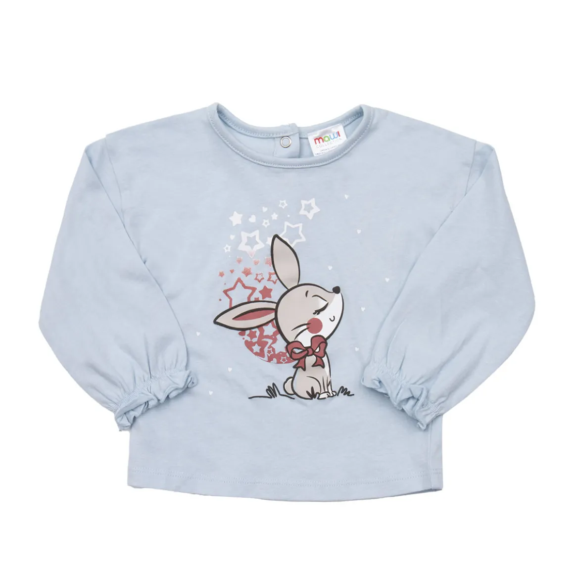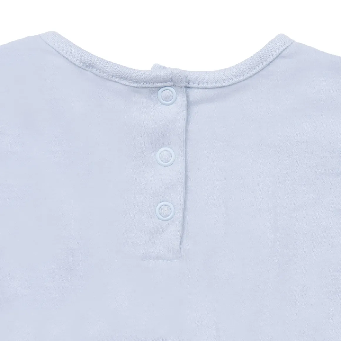 T-shirt manica lunga, in morbido caldo cotone in colore azzurro polvere con stampa. La forma morbida e arricciata delle maniche, donano un tocco di eleganza al capo. L’apertura sul retro con bottoni a pressione facilita il passaggio testa. Disponibile in diverse varianti.
