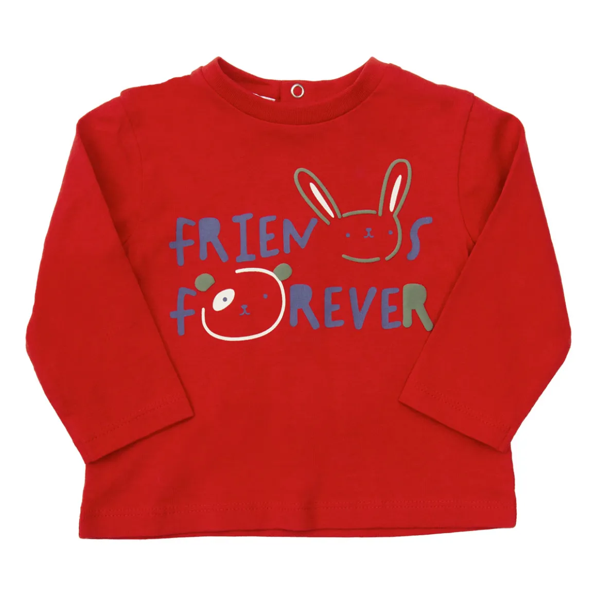 Dolcissima t-shirt jersey rossa con stampa animaletti con dettagli stampa in rilievo. Il capo presenta una comoda apertura sul retro. Coordinabile con i pantaloni della collezione.Vestibilità comoda. Disponibile in altri colori e fantasie.