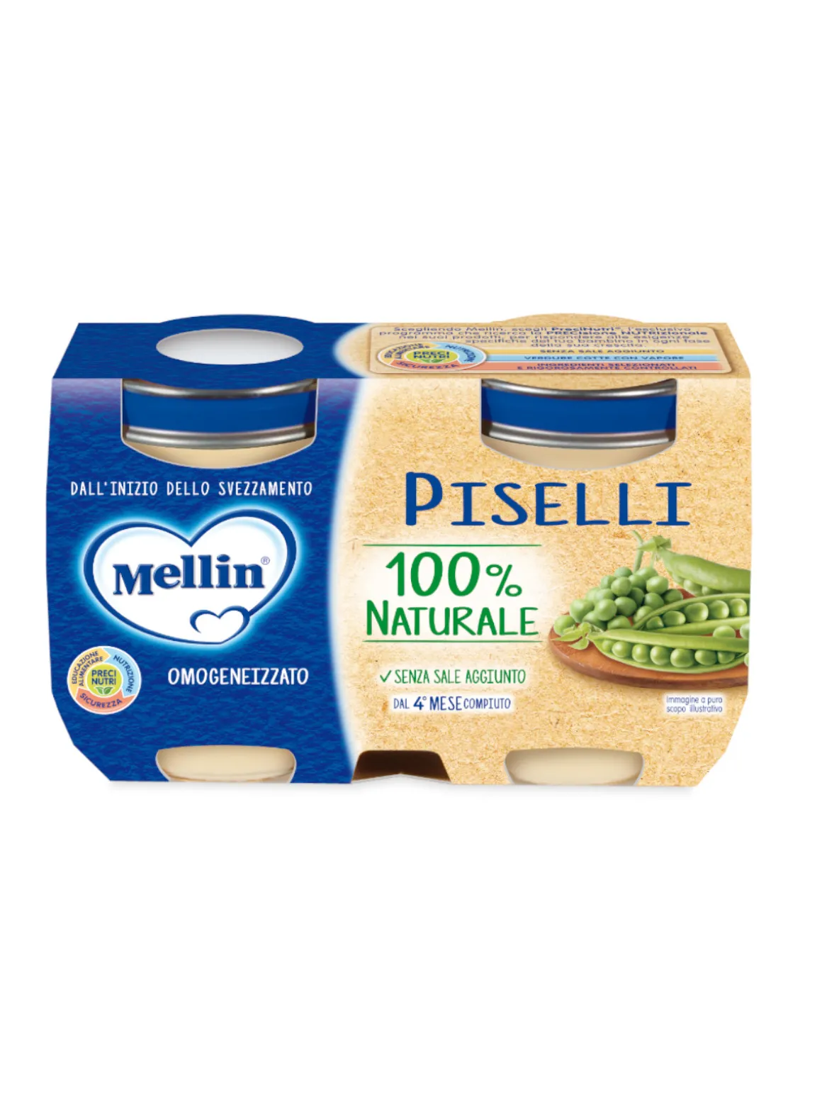 L’omogenizzato di piselli Mellin con PreciNutri è senza sale aggiunto, senza conservanti e coloranti, è cotto al vapore per salvaguardare le qualità organolettiche ed è sottoposto a rigorosi controlli qualitativi. Indicato dal 4° al 36° mese salvo diverso parere del Pediatra.