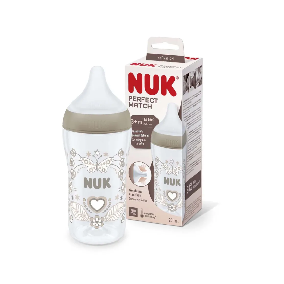 Biberon NUK Perfect Match, con tettarella in morbido silicone taglia M, 260 ml, da 3 mesi, senza BPA, anti-coliche, con controllo della temperatura nella variante Catalina Heart.