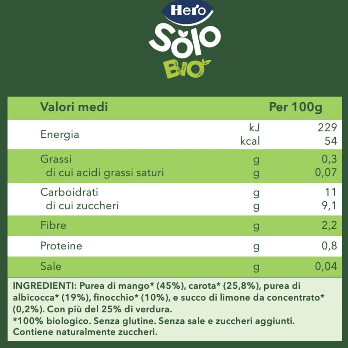 Alimento biologico per l’infanzia, indicato a partire da 12 mesi, salvo diverso parere del pediatra. Pouch Frutta e Verdura con mango, carota, albicocca e finocchio – quantità 100 gr.