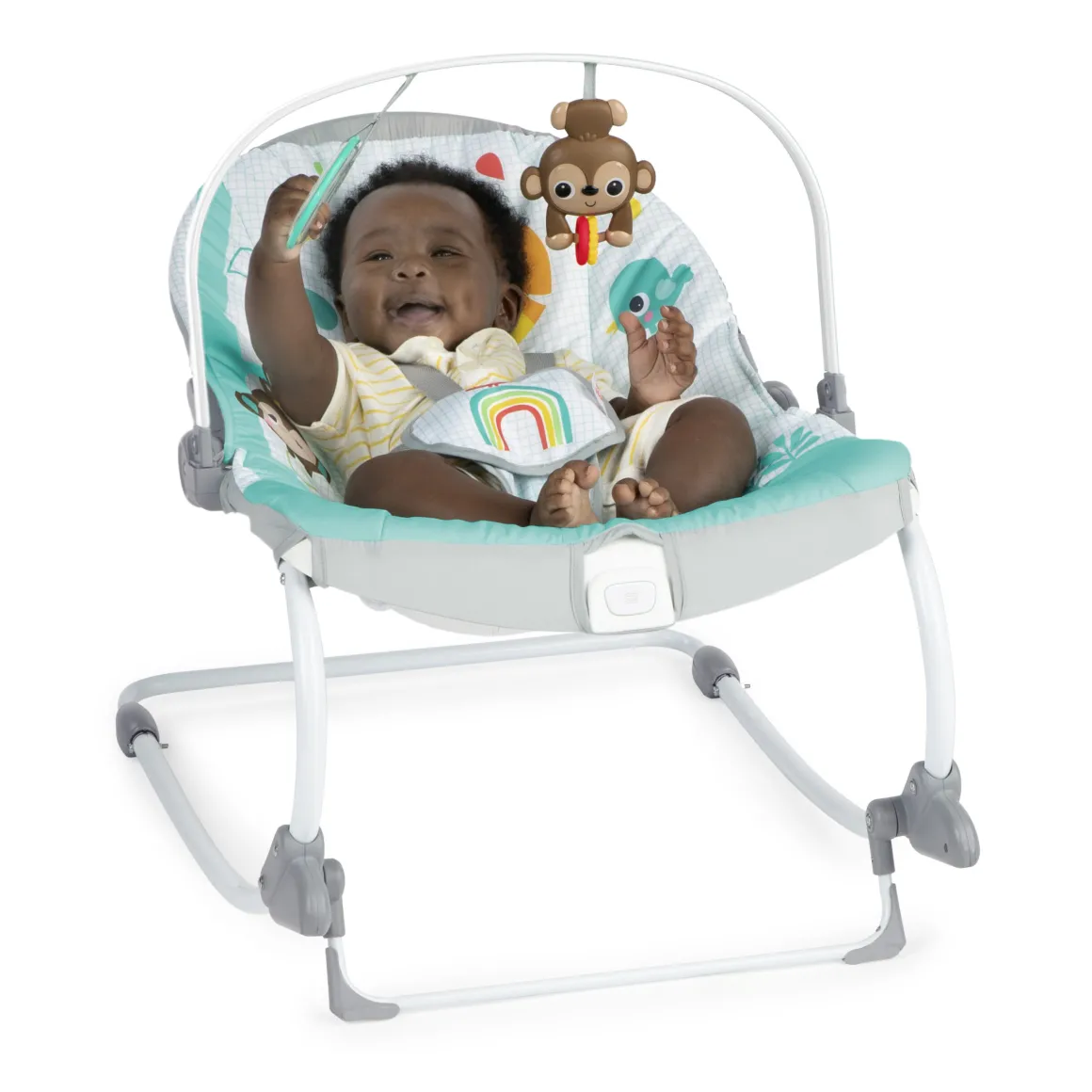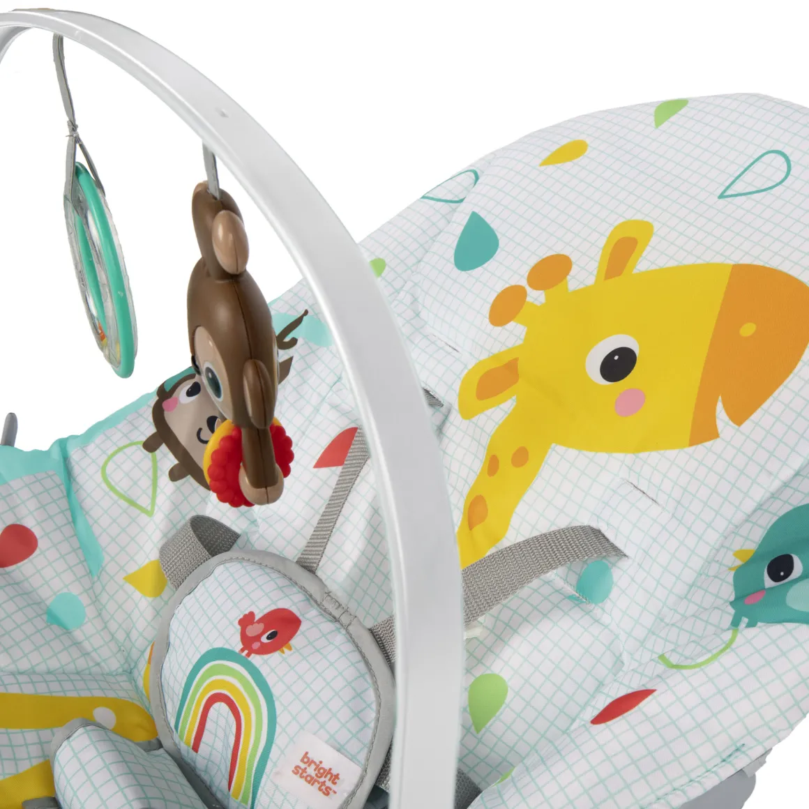 Regala al tuo piccolo selvaggio un safari rilassante con il dondolo e seggiolino fisso 2 in 1 Wild Vibes™ di Bright Starts™. Questo concentrato di potenza multi-uso cresce con il bambino ed è perfetto per neonati e bimbi più grandi! Gli adulti possono calmare il bambino nella modalità dondolo, mentre si diverte con la barra giocattolo che include un sonaglio colorato e un giocattolo a perline scorrevoli a forma di scimmietta. Le vibrazioni della sdraietta aiutano a mantenere calmo il bimbo mentre ti godi un momento a mani libere con il bimbo in vista. La funzionalità di vibrazione con un solo pulsante è integrata nel sedile, in modo da poter attivare o disattivare facilmente le vibrazioni in base alle preferenze del bambino. Per reclinare la sdraietta, utilizza i pulsanti sotto la barra giocattolo su entrambi i lati della seduta per regolarla in avanti e all’indietro. Utilizza il cavalletto anteriore per passare da dondolo a seggiolino fisso. Quando ti sposti, quando il piccolo non è nella sdraietta è sufficiente sollevarla su ciascun lato per spostarla da una stanza all’altra. Questo sedile tuttofare cresce con il bimbo fino a 18 kg, così potrai usarlo come dondolo per neonati e come seggiolino per bambini quando cresce! Goditi un po’ di tempo con questo dondolo con cuscinetto rimovibile lavabile in lavatrice, a prova di qualsiasi pasticcio. Il regalo perfetto per un baby shower o per celebrare l’arrivo di un bebè!
