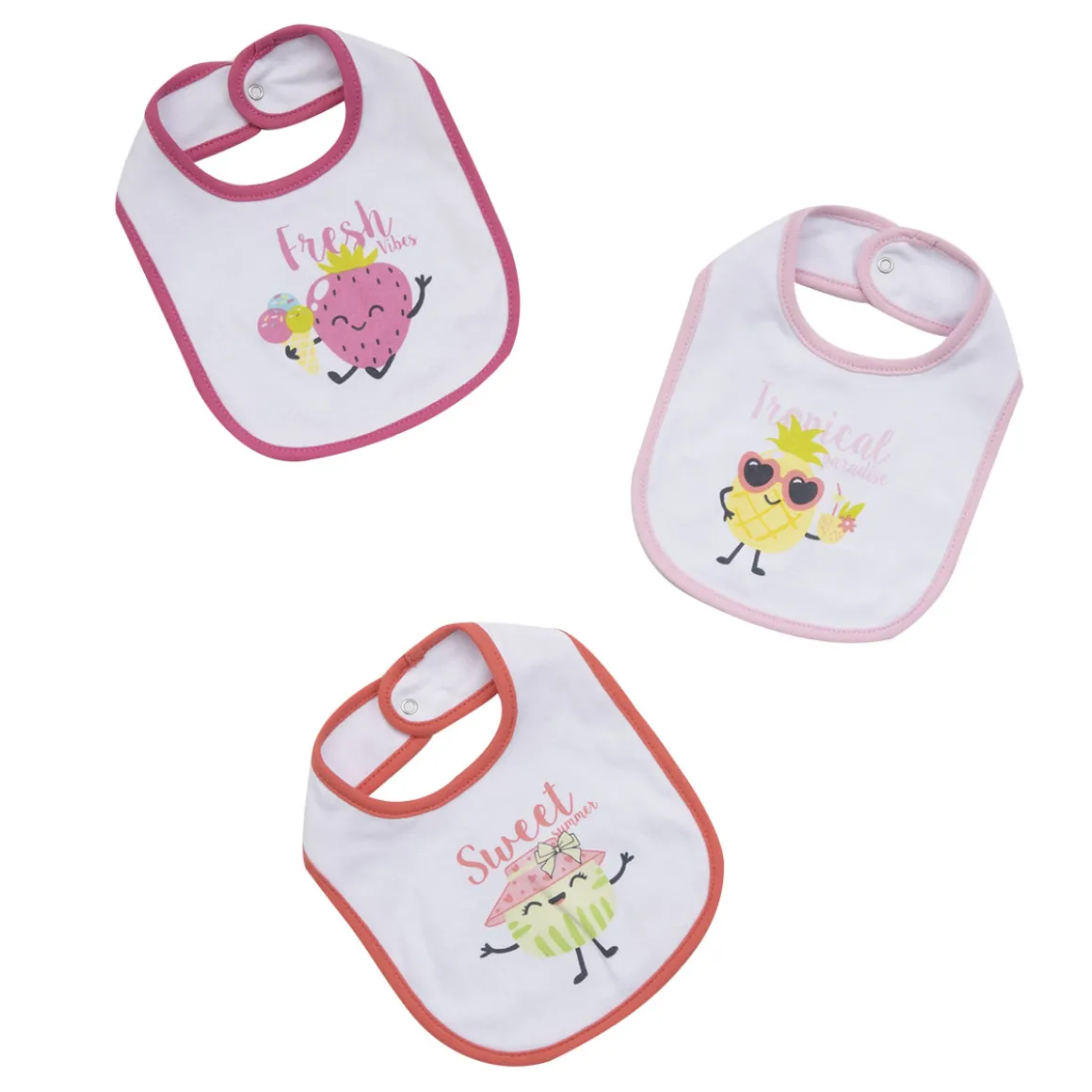Pack 3 bavaglini bimba su base bianco con disegnini in varie colorazioni coordinate. L’indossatura è pratica e sicura grazie a bottone a clip sul girocollo.