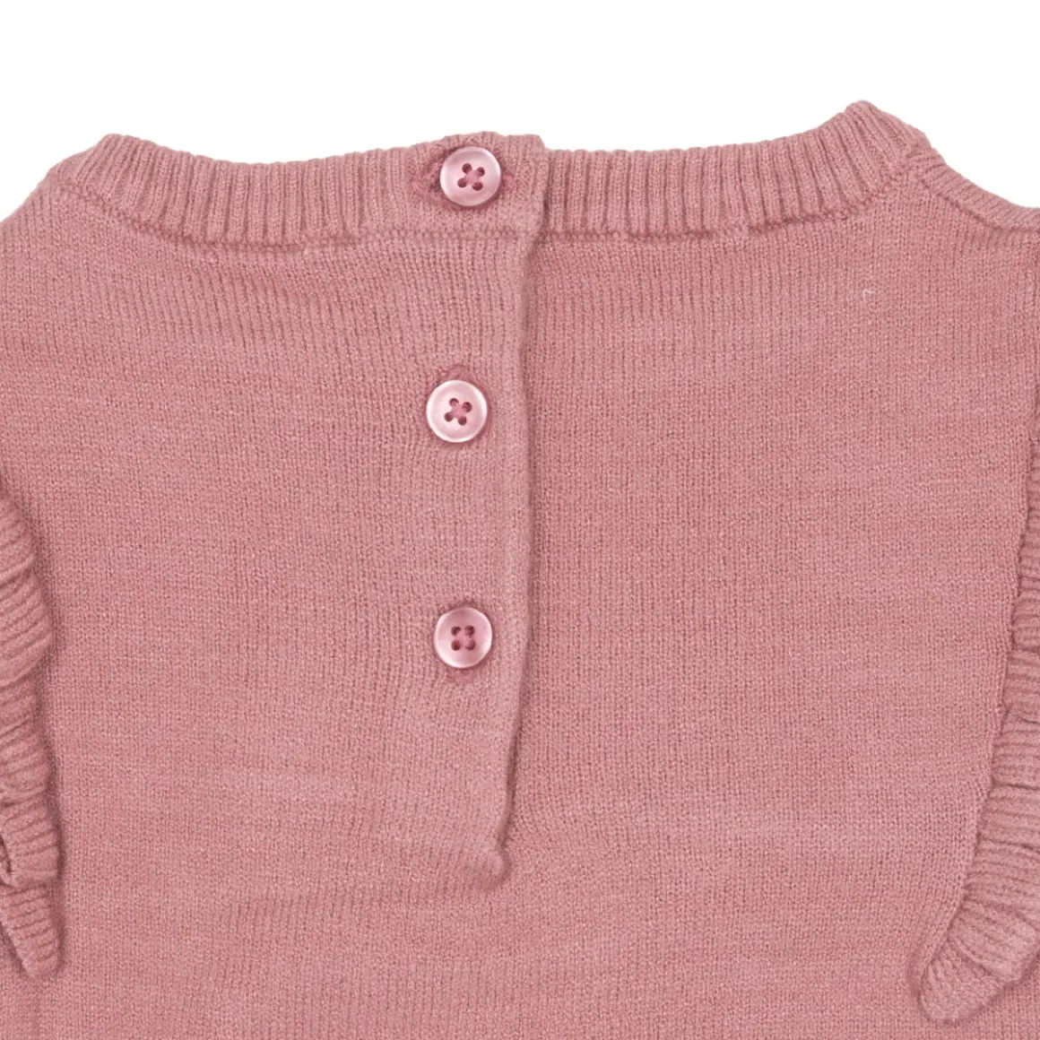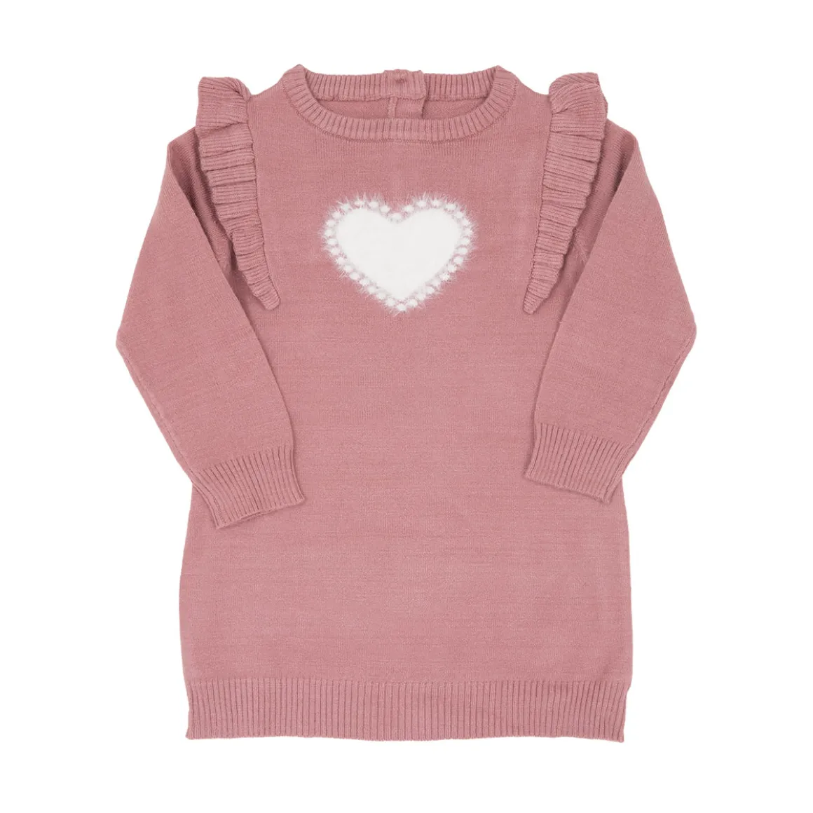Tenero abito tricot da bambina. Il capo si presenta in tinta unita rosa antico con intarso cuore grande sul davanti e rouches sulle spalline. Modelllo girocollo di lunghezza media offre una buona copertura. La vestibilità è morbida e pratica grazie ai bottoni sulla schiena. Accessori non in vendita. La confezione contiene solo il capo di abbigliamento